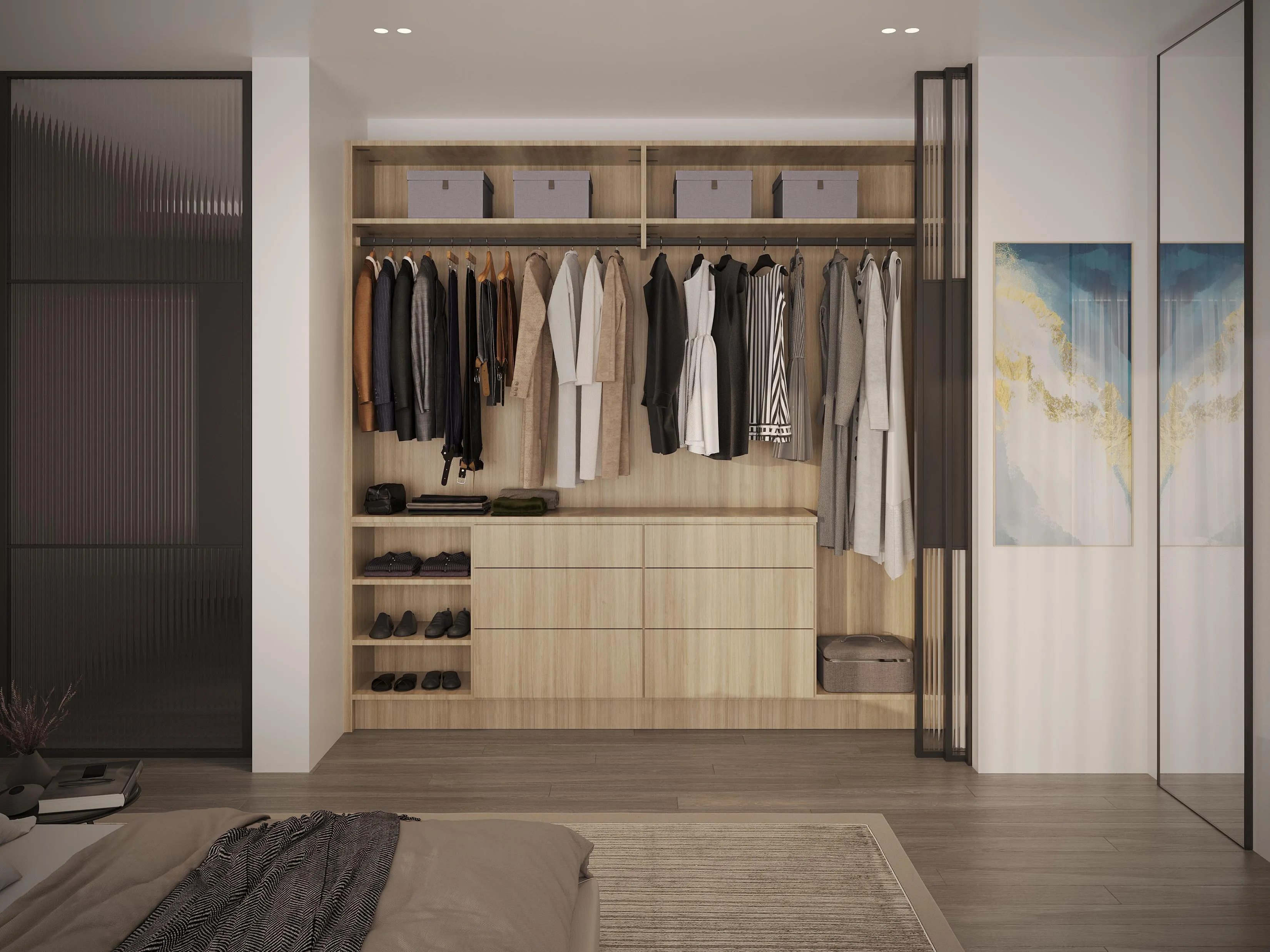 An entrance closet is more singular in its purpose: storage for clothing and shoes. Entrance closets are designated, enclosed spaces, often located at the home's main entrance or foyer, so residents can hang coats, stash shoes, and tuck away other outdoor accessories quickly. Due to their typically compact nature, entrance closet design leans towards functionality with built-in shelving, hanging rods, and perhaps shoe racks.